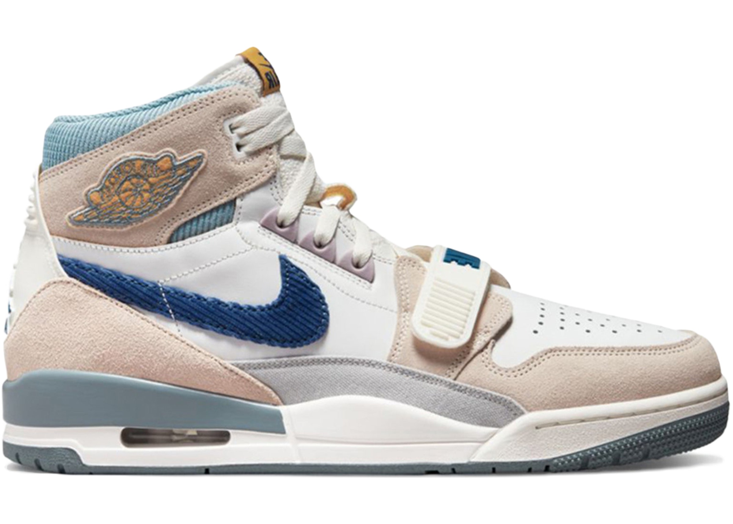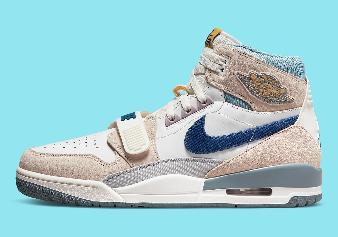 The Nike Air Jordan Legacy 312 Corduroy Swoosh features a white leather base with a bevy of textured overlays, from warm beige suede on the toe, heel and ankle cuffs, to grey canvas mudguards and blue corduroy checks.