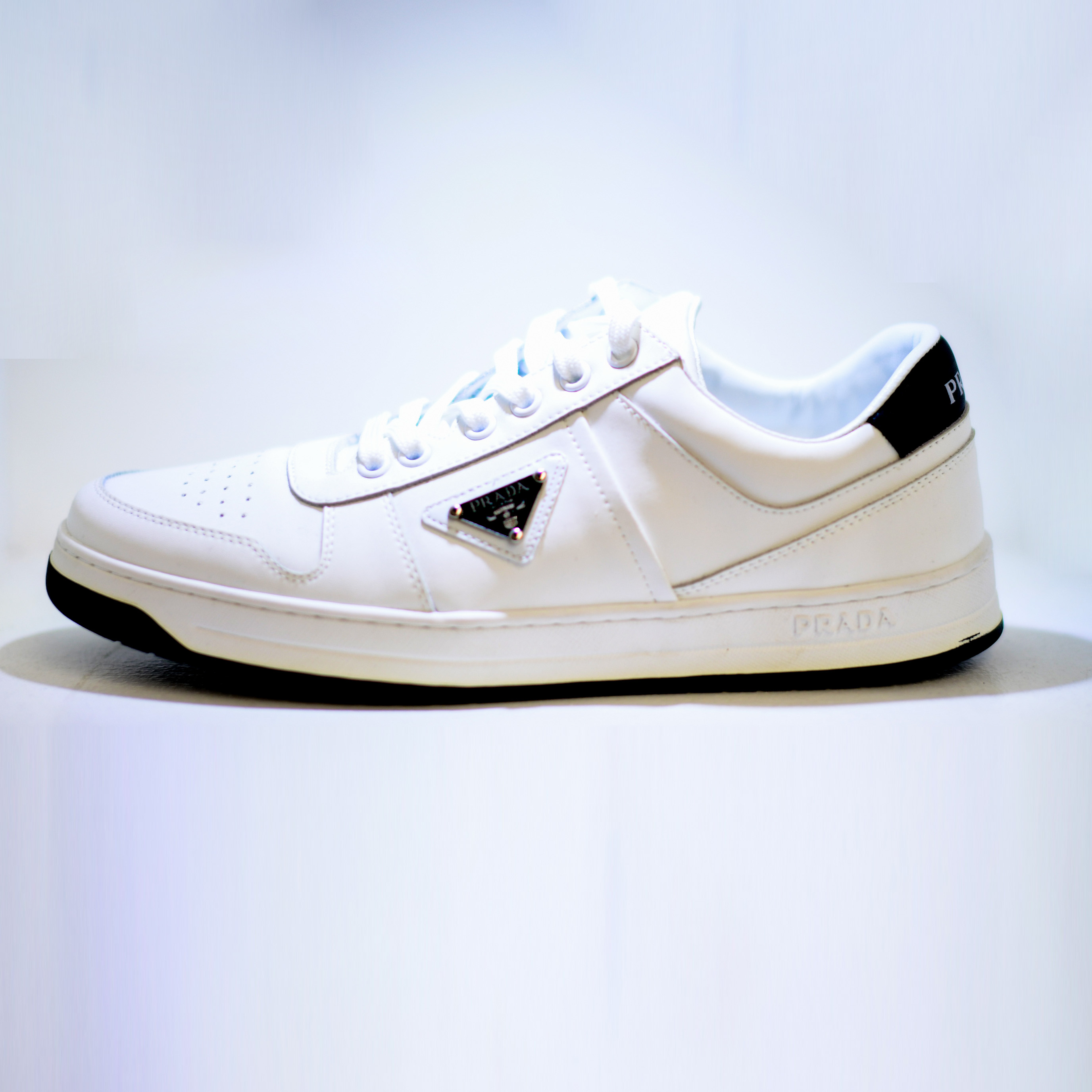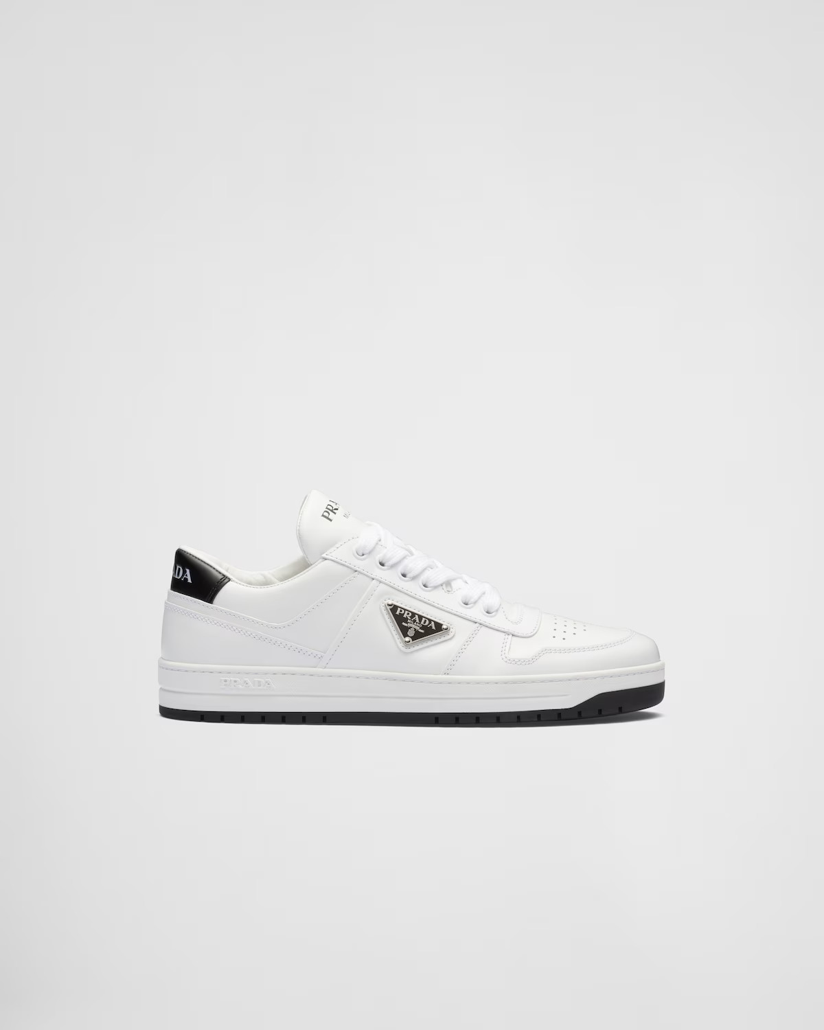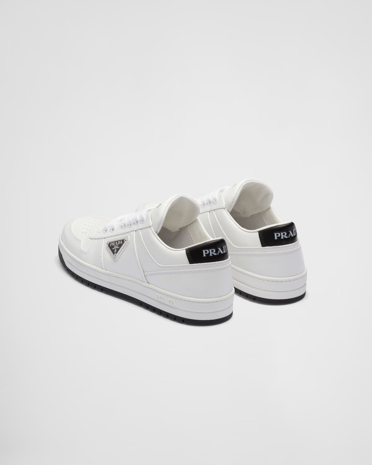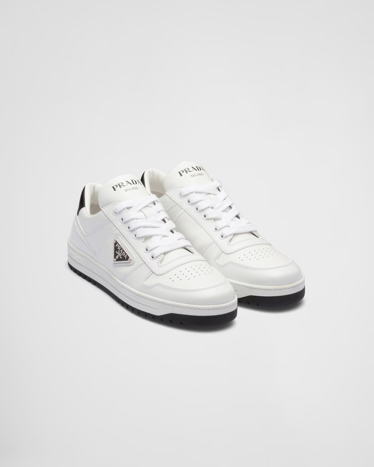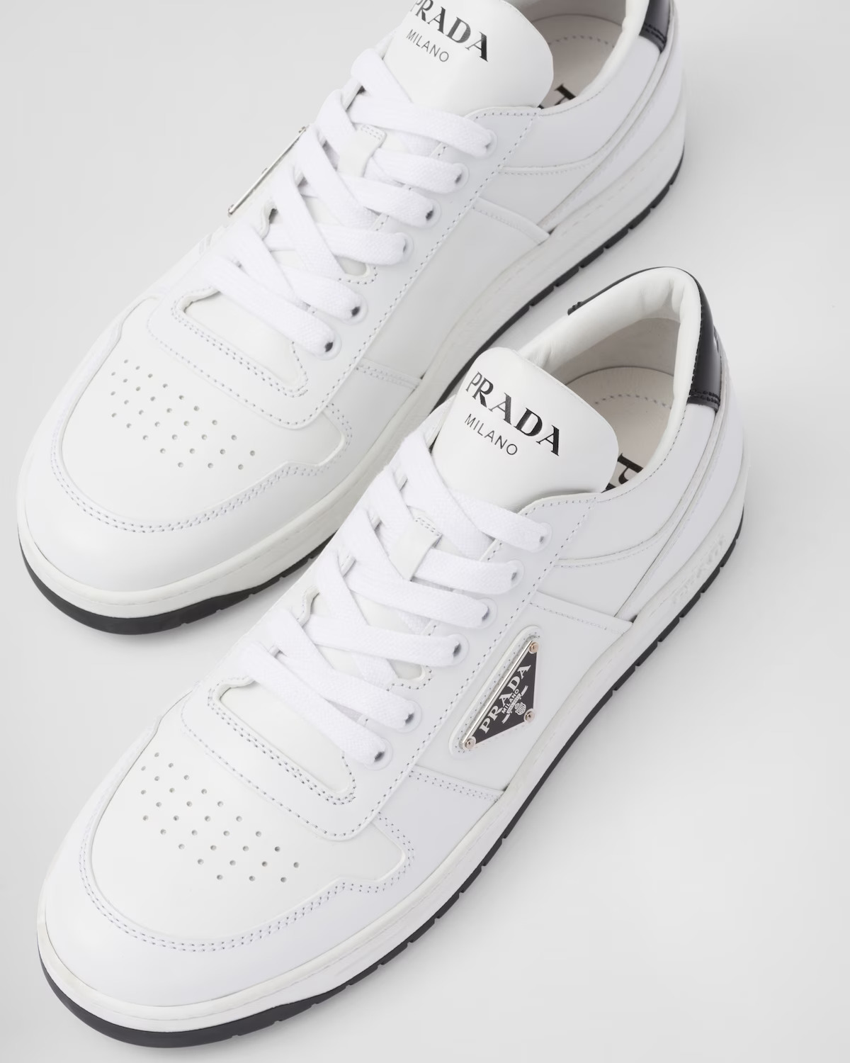 These sporty leather sneakers are accented with different interpretations of the Prada logo that appears on the tongue, along the light rubber sole, and as the iconic enamelled metal triangle decorating the side of the upper.